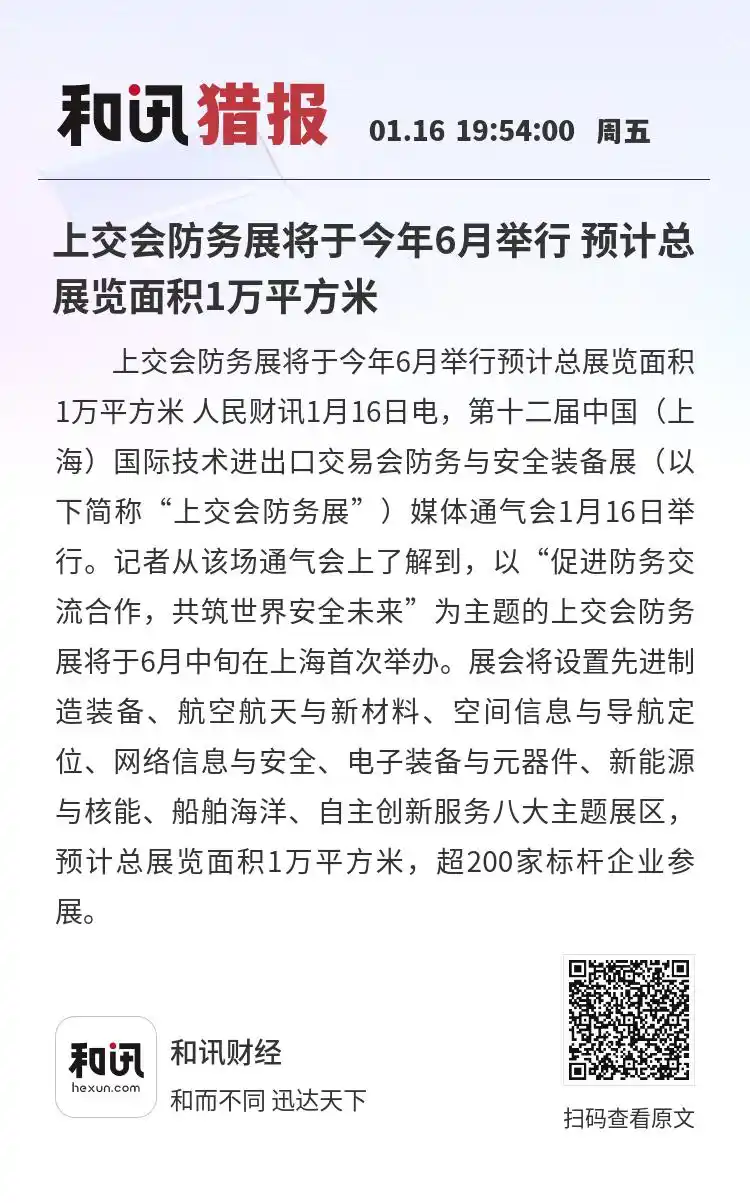 上交会防务展将于今年6月举行预计总展览面积1万平方米人民财讯1月16日电,第十二届中国(上海)国际技术进出口交易会防务与安全装备展(以下简称“上交会防务展”)媒体通气会1月16日举行。记者从该场通气会上了解到,以“促进防务交流合作,共筑世界安全未来”为主题的上交会防务展将于6月中旬在上海首次举办。展会将设置先进制造装备、航空航天与新材料、空间信息与导航定位、网络信息与安全、电子装备与元器件、新能源与核能、船舶海洋、自主创新服务八大主题展区,预计总展览面积1万平方米,超200家标杆企业参展。